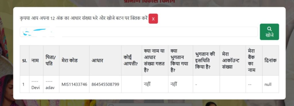 आधार नंबर डालने के बाद बस आपको खोजे के आप्शन पर क्लिक कर देना हैं , जिसके बाद आपका Mahila Rojgar Yojna का Payment Status दिख जायेगा |